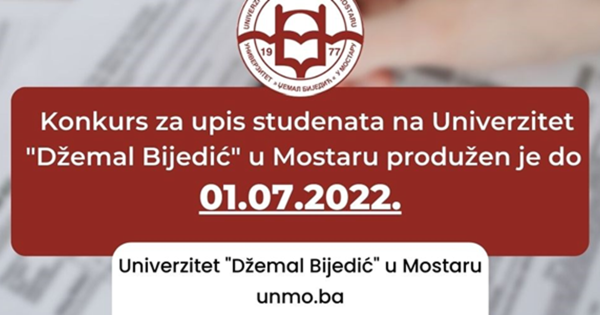 Obavještavamo maturante i sve zainteresovane kandidate za upis na neki od fakulteta ili univerzitetskih studija na Univerzitetu „Džemal Bijedić" u Mostaru da je konkurs za upis studenata produžen do 01.07.2022. godine. ...