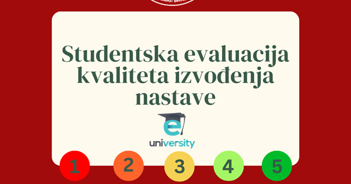 Poštovani studenti, Obavještavamo Vas da će u periodu 27-31.5.2024. godine biti provedena Studentska evaluacija kvaliteta izvođenja nastave u okviru koje ćete imati priliku evaluirati svakog nastavnika, saradnika i stru ...