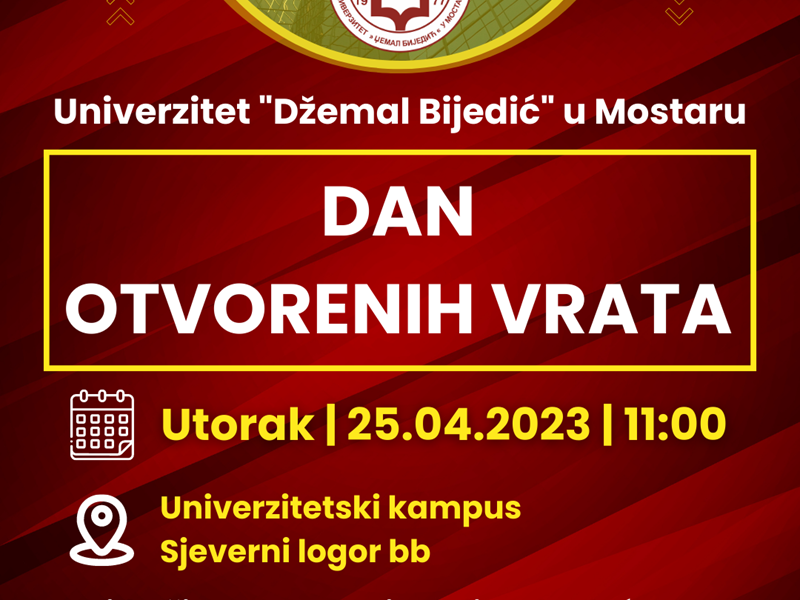 Dan otvorenih vrata na Univerzitetu “Džemal Bijedić” u Mostaru bit će upriličen u utorak, 25. aprila 2023. godine u univerzitetskom kampusu Sjeverni logor. Dan otvorenih vrata predstavlja priliku za maturante i buduće studente da se upoznaju i dodatno informišu o radu Univerziteta “Džemal Bijedić” u Mostaru i mogućnostima studiranja na fakultetima ili univerzitetskim studijima koje planiraju upisati u skladu sa svojim afinitetima.