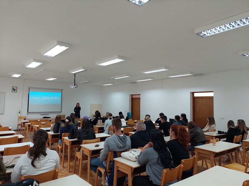 Erasmus koordinatorica Emina Mehić, MA, dr.sc. Maja Kazazić, van.prof. i referentica za međunarodnu saradnju Univerziteta “Džemal Bijedić” u Mostaru Mirsada Behram upoznale su prisutne sa mogućnostima međunarodne razmjene i uslovima za apliciranje.