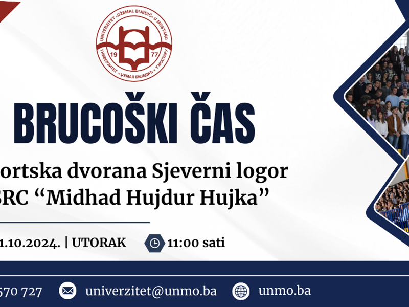 Obavještavamo studente prve godine fakulteta i univerzitetskih studija na Univerzitetu "Džemal Bijedić" u Mostaru da će tradicionalna manifestacija Brucoški čas biti upriličena u utorak 1. oktobra 2024. godine sa početkom u 11:00 sati. Brucoški čas će biti održan u Sportskoj dvorani Sjeverni logor (USRC Midhat Hujdur Hujka).